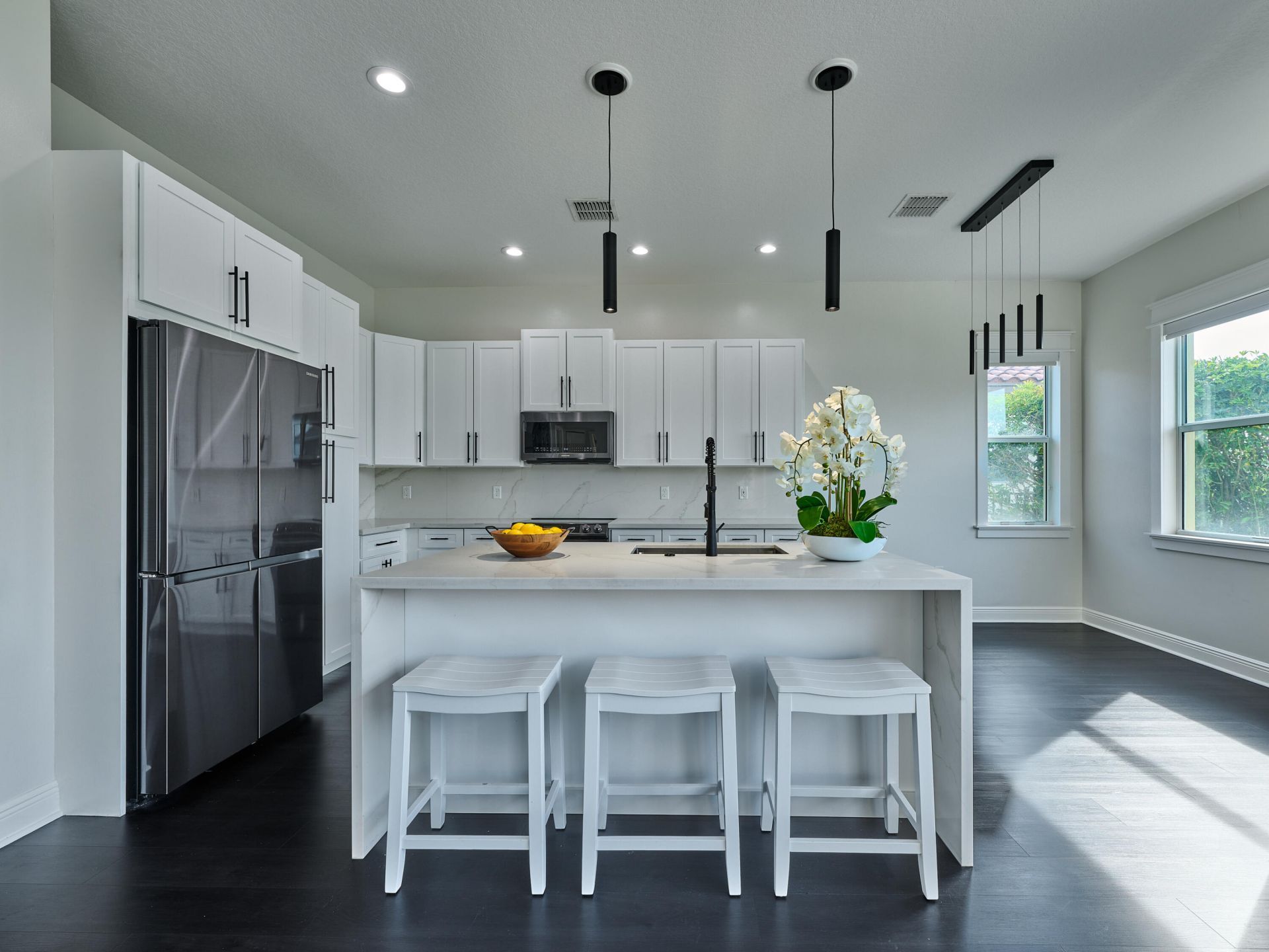 Updated and impeccably clean. Ready to move in. 3BR/3BA + den/office with breathtaking lakefront views. Private first-floor bedroom and cabana bath, ideal for a guest suite or office. Dream kitchen. Updates include flooring, cabinets, quartz countertops, large island, and backsplash, stainless steel appliances, lighting, ceiling fans, hardware, remote-control blinds, impact windows and doors throughout. Large back yard features travertine patio pavers, outdoor shower, fire pit, room for a pool, and fishing in the lake. Resort-style amenities include pickleball, tennis, pool, hot tub, clubhouse, fitness center, splash pad, basketball, volleyball, walking trails, and more. Convenient to schools, shopping, dining, and recreation. Must see. Low HOA 3 bedroom with a den/office (could be 4th bedroom) Lakefront Low HOA Updated, move in ready. Very clean and well maintained.