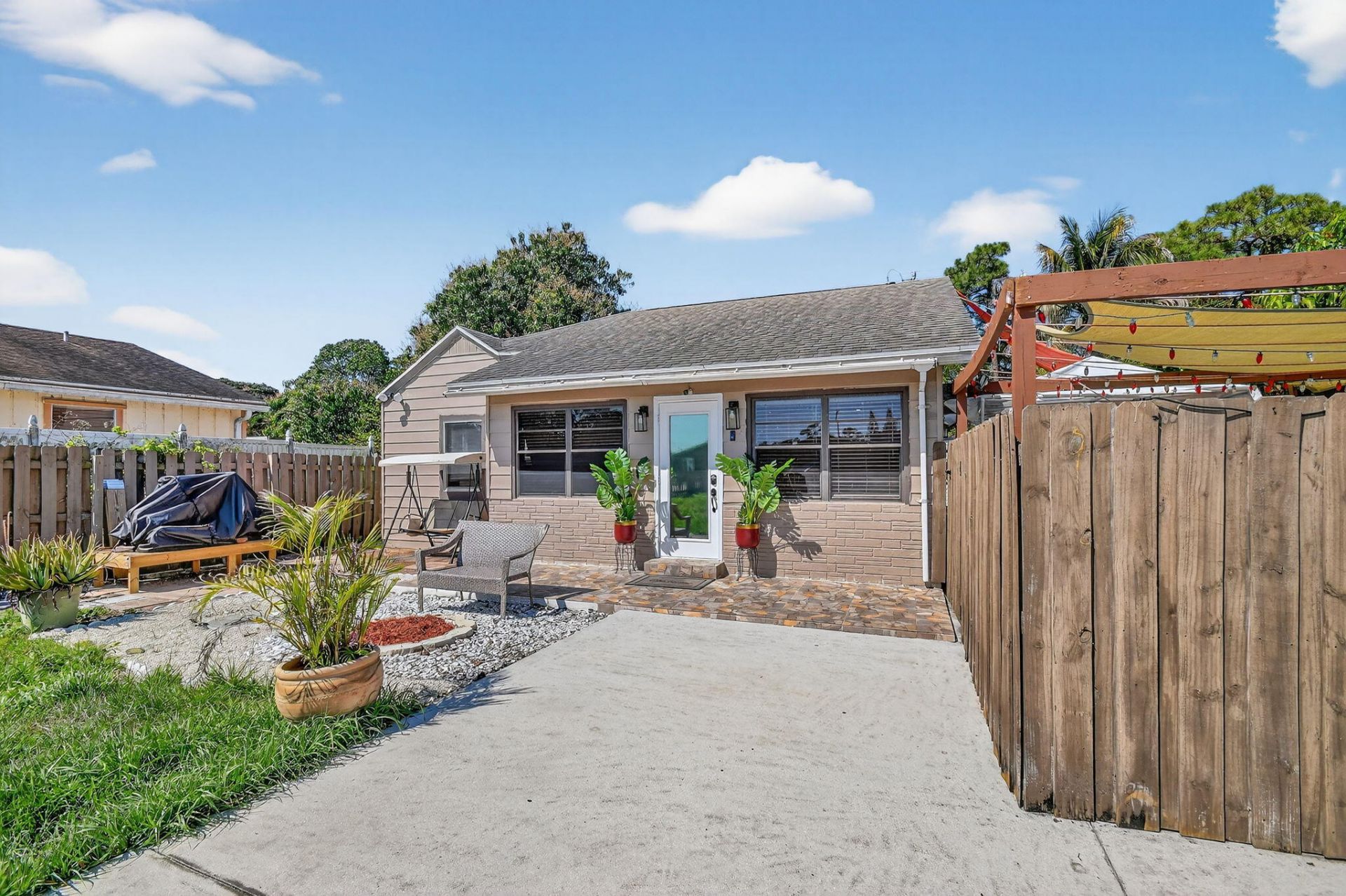 Beautifully updated 3 bedroom, 3 bathroom single family home. oOffers an open-concept floor plan with porcelain tile flooring throughout the main living areas, neutral paint, and abundant natural light. Kitchen features white cabinetry, granite countertops, stainless steel LG appliances, and a breakfast bar. The primary suite includes a spa-like bathroom with a frameless glass walk-in shower, modern fixtures, and LED mirror. This versatile property includes a separate efficiency with its own private entrance-an excellent income-producing opportunity for rental income, guests, or multigenerational living. This house is move-in ready, features a HUGH front yard with parking for up 8 vehicles, lots of room for entertainment and remote controld gate. Schedule your private tour today!